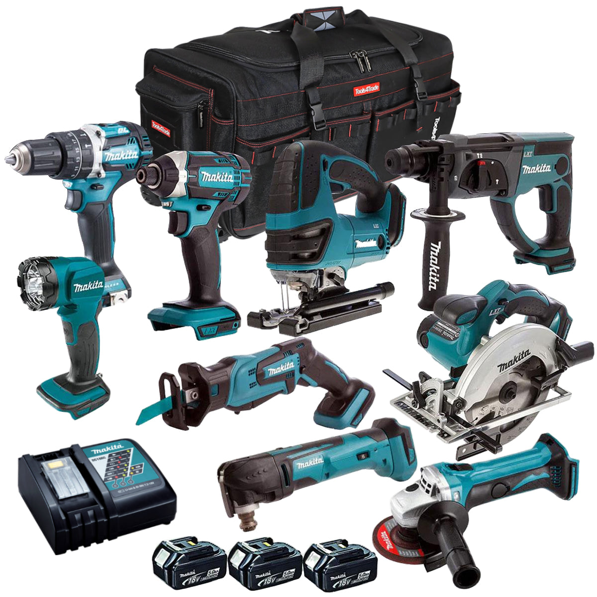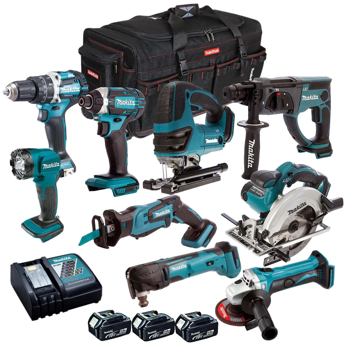 Makita 18V 9 Piece Power Tool Kit with 3 x 5.0Ah Batteries with Charger & Bag T4TKIT-12997